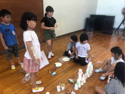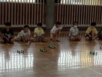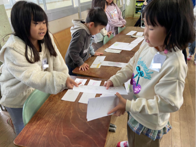 生活科の学習でおもちゃランドを作って、2年生が1年生を招待しました。魚つり、射的、風で動く自動車など様々な自分たちで作ったおもちゃで遊んでもらって、1年生に楽しんでもらおうと頑張っていた2年生です。遊び方の説明も上手にできました。暑い中でしたが、1年生にも喜んでもらえて1学期の良い思い出ができました。