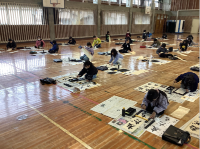 3年生は、体育館で「書き初め大会」をしました。条幅用紙に「友だち」と書きました。いつもとは違う場所や用紙の大きさにドキドキしたようですが、集中して書いていました。