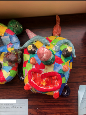 2年生は、図工の学習でお面を作りました。厚紙で作った枠に新聞紙を貼るところ始まり、作り工程が多く根気も入りましたが、最後まで丁寧に作り上げることができました。個性的で工夫がいっぱいのお面が完成しました。
