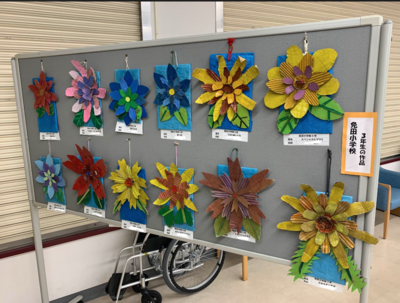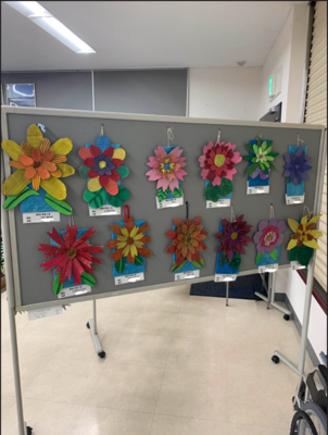 3年生は図工でお花の壁飾りを作りました。思い思いの綺麗な花を想像し、ダンボールで製作しました。