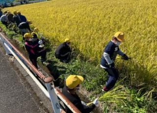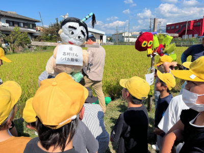 5年生は総合的な学習の時間に稲刈りを行いました。鎌を使って稲を刈ったり、稲の束を紐でくびったりと、昔ながらのやり方を体験させていただきました。また、前回のかかし立ての日から行われたかかしコンテストの結果発表も行われ、上位だった班の子供たちにはJAの方から素敵な商品もいただきました!期間中、投票箱にはたくさんの投票や子供たちへのメッセージが入っておりました。本当にありがとうございました!!