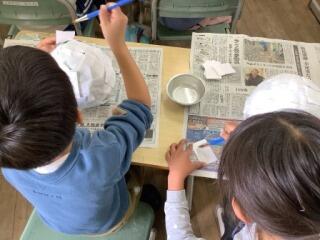 今は、風船の周りに何層にも重ねながら紙を貼っているところです。