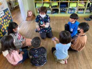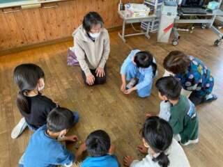 地域の方と一緒に昔あそびをしました。遊び方のコツを教えてもらい楽しく遊ぶことができました。