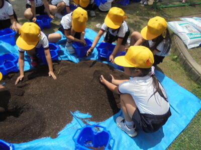 生活科の時間に、種の観察をしました。目・耳・鼻・手を使って観察をしました。でこぼこしていることに気付いたり、お月様みたいに見えたりしたことを発表しました。その後、植木鉢に土入れをしました。柔らかい土に大喜びでした。
