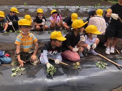 生活科の時間に芋の苗さしをしました。浦本さんをはじめ、地域の方々に丁寧に教えていただきながら苗を植えました。大きくなーれ❗️と言いながら、大事そうに植えていました。その後、組んだ水をかけました。秋の収穫が楽しみです。