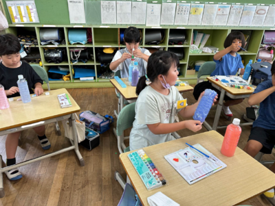 2年生は、図工で「見つけたよ、わたしの色水」の学習をしました。ペットボトルの中に絵の具を溶かして、自分なりの色水を作りました!