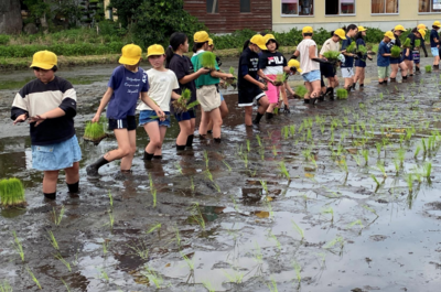 6月20日(火)に5年生は、田植えをしました。とても広い田んぼでしたが、全員で集中して作業に取り組みました。ご協力いただいたJA青壮年部の方から「子どもたち一人一人が上手に植えていたから、早く終わった。それに、真っすぐきれいに植えることができました。」とお褒めの言葉をいただきました。たくさん泥で汚れましたが楽しいひと時でした。