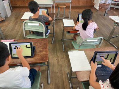 2学期に入り、タブレットの使い方を少しずつ学習しています。色々な使い方を覚える度、とても嬉しそうな子どもたちです。国語の学習の中で、平仮名の書き順を覚えるためのゲームを行いました。46文字クリアした子どもたちのは達成感を感じているようでした。これからも様々な場面でタブレットを活用していきます。