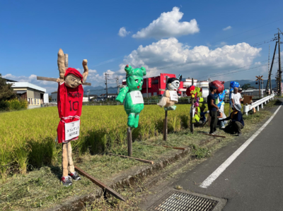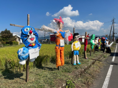 かかし立てに行ってきました!約1ヶ月間、みんなで協力して作ったかかしがずらりと並んでいます。約2週間展示されると思いますので、ぜひ足を運んでみてください。また、投票箱を設置していますので、いいなと思うかかしに投票をお願いします!