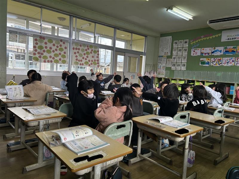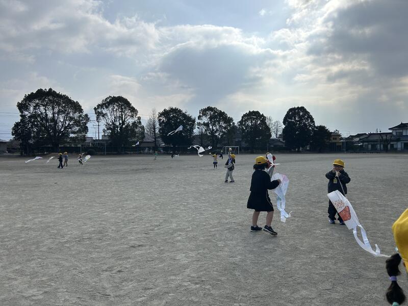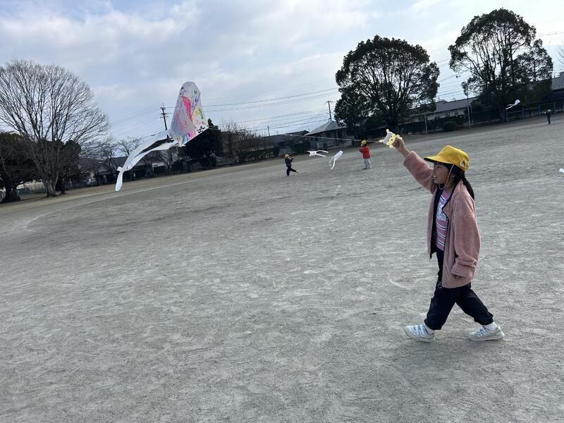 生活科では、凧を作り、凧あげに挑戦しました。最初は難しそうにしていましたが、慣れてくると凧糸を長く伸ばし、上手にあげられるようになりました。また、音楽の時間には、じゃんけんで遊ぶ「おちゃらかほい」や、縄で遊ぶ「おおなみこなみ」などのわらべ歌を学習しています。学習した遊びを、休み時間にも楽しむ子供たちです。