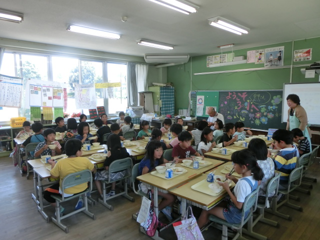 一緒に給食を食べました。特産の野菜の説明もしていただきました。