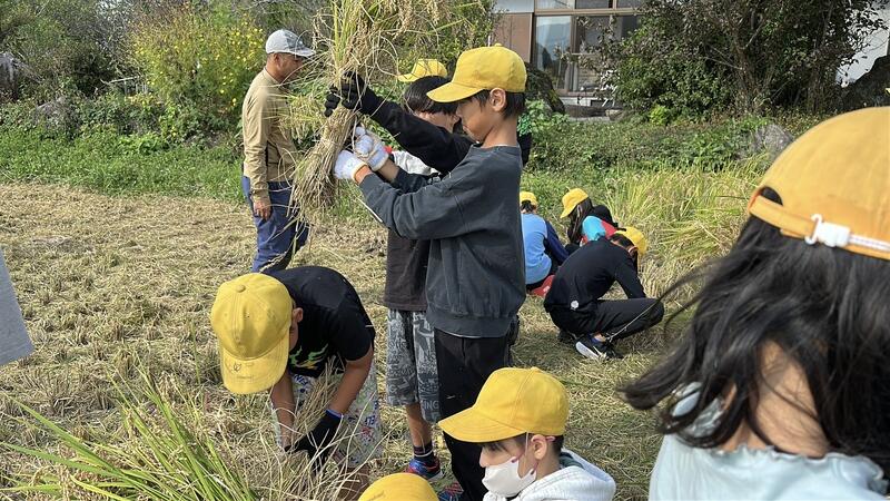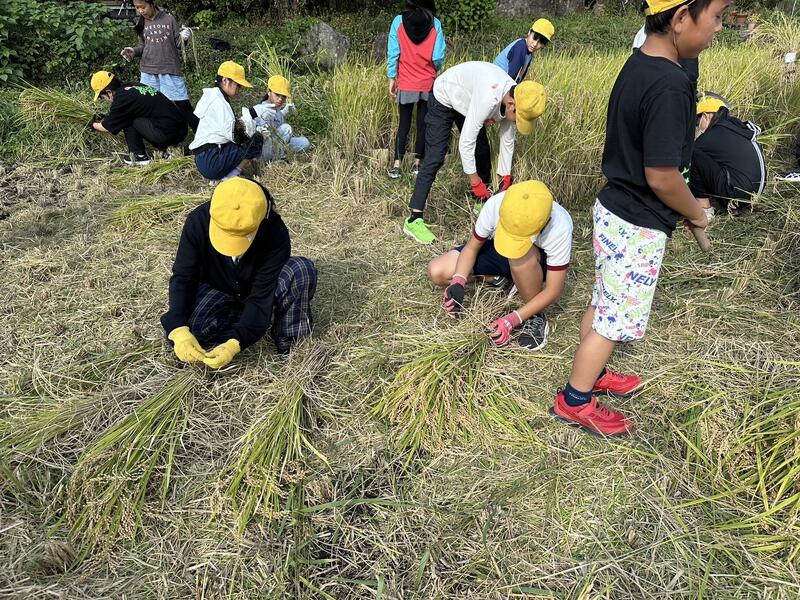 10月27日、5年生は総合的な学習の一環で稲刈りを行いました。6月に植えた苗が大きく成長していました。鎌で稲を刈り取り、束にして結んだあと、干すという流れで作業しました。初めはうまく刈り取ることができずに苦労する様子が見られましたが、すぐにコツを掴み素早い作業が行えるようになりました。稲刈り後には、かかしコンテストの結果が発表され、上位のグループにはJA青壮年部からお肉やメロンの豪華賞品が贈られました。次回の餅つきが楽しみです。