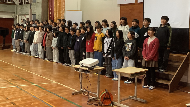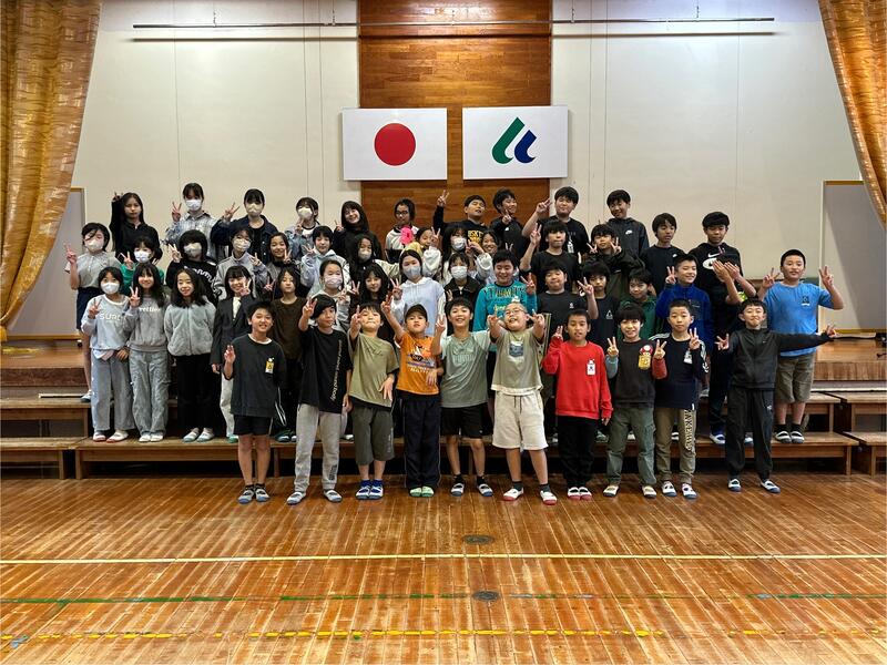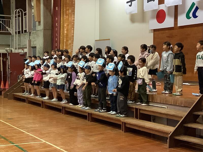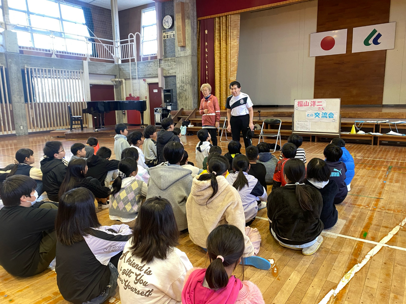 11月25日(火)に全盲の福山洋二さんと交流しました。まずは体育館で福山さんと一緒に走る体験をしました。カーブを曲がるときは「もうすぐ曲がります」、次の人に代わるときは「もうすぐ次の人に代わります」と声を掛けたり、福山さんが走りやすいように前を優先して走ったりと、みんなとても上手にできていました。福山さんからも「安心して走ることができました」と言っていただき、子どもたちも嬉しそうでした。次に、福山さんの話を聞いたり、歌を一緒に歌ったりという交流をしました。作詞・作曲が福山さんの曲や校歌をみんなで歌いました。とても学びのある充実した時間になったと思います。