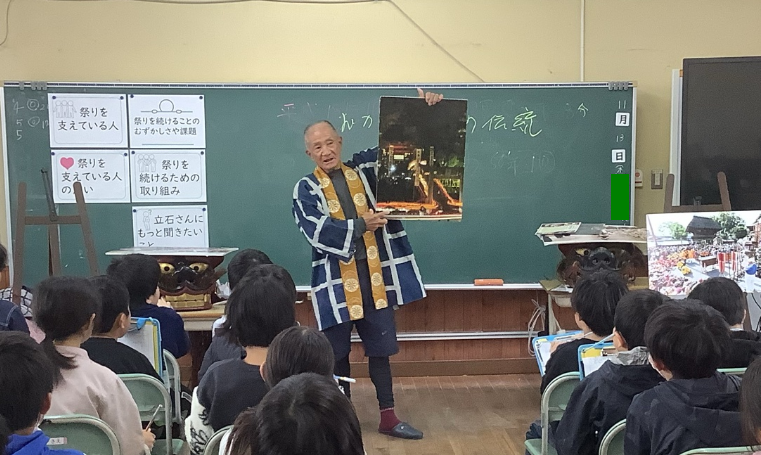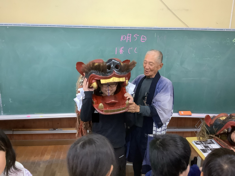 11月13日(木)に4年生は社会科の学習で「おくんち祭り」について語り部さんからお話をお聞きしました。講師として人吉球磨伝統文化塾代表の立石さんに来ていただきました。立石さんからは、青井阿蘇神社の由来やおくんち祭りの歴史などについて、写真を基に話していただきました。また、獅子面の実物を持ってきていただき、子ども達はその迫力ある表情をまじまじと見ながら恐る恐る近づいていました。立石さんのお話を通して子ども達は、「おくんち祭り」が人吉球磨の人たちにとって特別なものであり、これからも受け継いでいくべきものだということを強く感じたようでした。また、免田小校区にある昔から受け継がれているものにも興味をもったようでした。これから調べてみたいと思います。