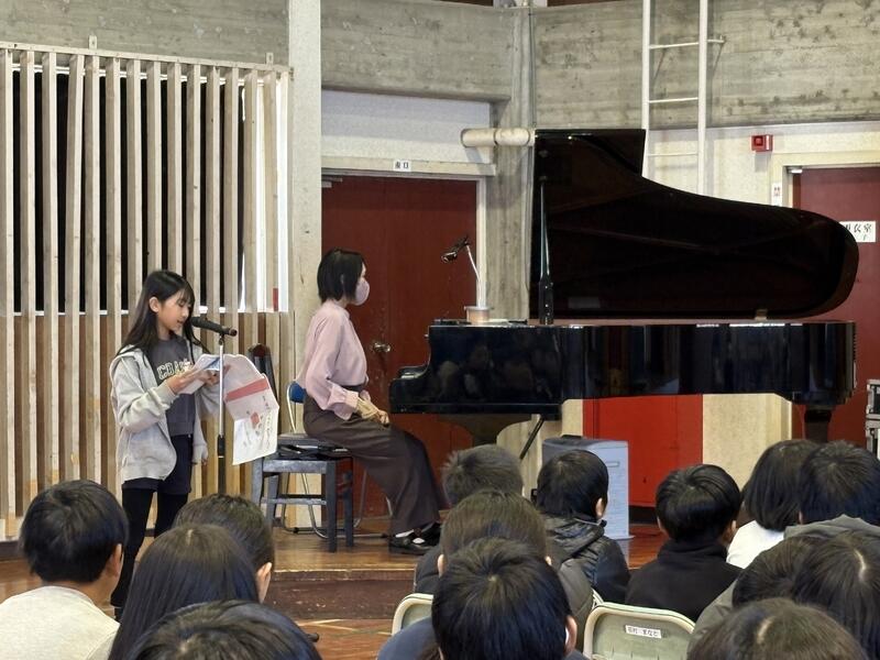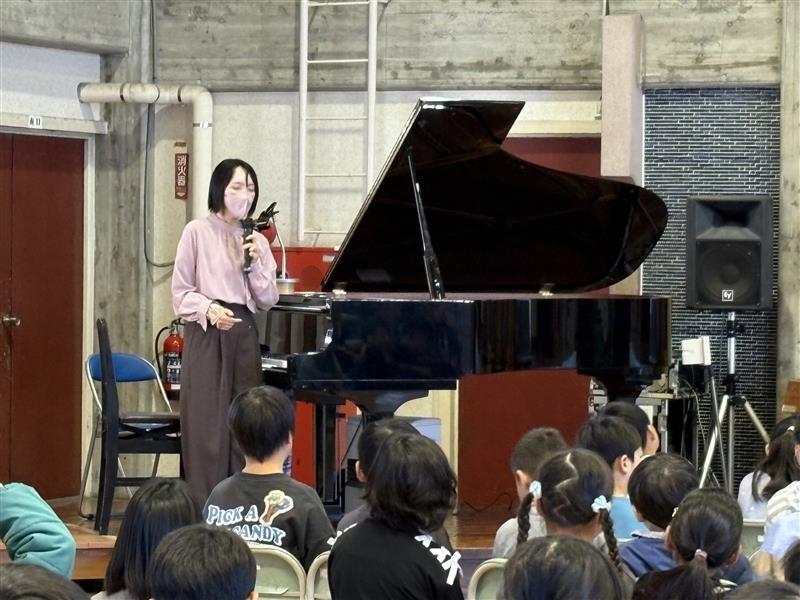 11月28日(金)の2・3校時にあさぎり町在住のピアニスト、月足さおりさんのコンサートがありました。月足さんは、生まれつき進行性の難病と闘いながらピアノの演奏をされています。左手だけで心に響く演奏をされました。また、右手で弾けるようになりたいとロボットを使ってリハビリをされており、両手で「となりのトトロ」を演奏され、音色の美しさに子どもたちも感動していました。