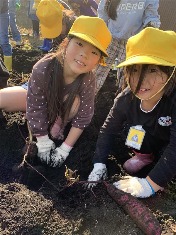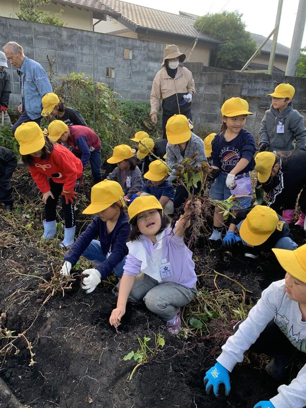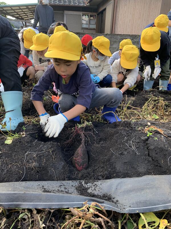 八幡区シニアクラブ浦本様の畑をお借りして6月に芋の苗植えをしたお芋が大きくなり、27日(木)に1・2年生のみんなで芋ほりをしました。子ども達はみんな嬉しそうに収穫をして、芋を家に持ち帰りました。数日後「てんぷらにして食べたよ。」「味噌汁に入れて食べたよ。」と教えてくれました。浦本様や教えに来てくださった地域の方に感謝して食べたようです。