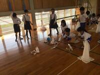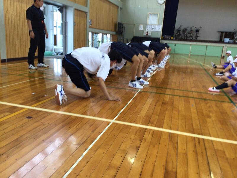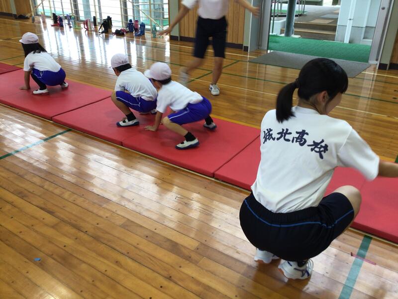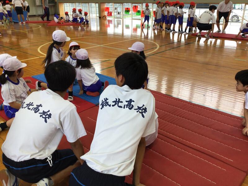 14日(水)5時間目の体育の時間、城北高校から12名のお兄さんお姉さんが学習の応援に来てくださいました。普通科のスポーツ科学コース総合スポーツ専攻の12名のお兄さんお姉さんも、1年生を前にちょっと緊張気味でした。