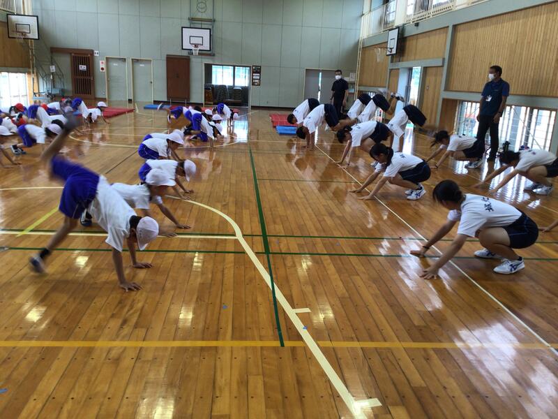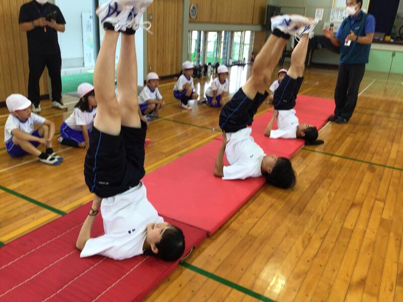 はじめに、準備運動やマット運動につながるトレーニングゲームをしました。お兄さんお姉さんもブリッジのお手本や倒立のお手本なども見せてくださいました。