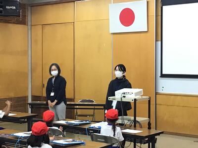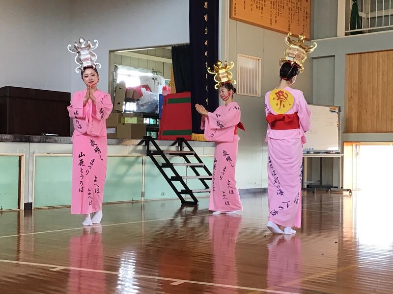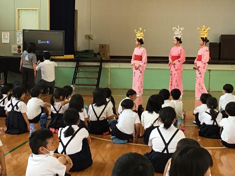 初めに、山鹿灯籠祭りの説明と灯籠踊りの説明のビデオを視聴しました。次に、灯籠踊り保存会の3名の方が二通りの灯籠踊りを披露してくださいました。子どもたちは、静かに流れるような踊りの美しさに魅了されていました。
