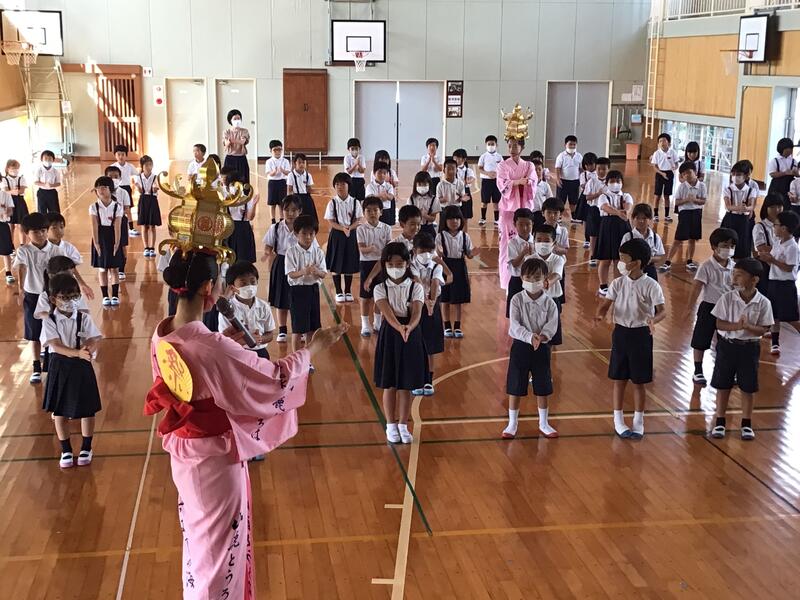 4日(火)1時間目の生活科の時間に「学校に山鹿灯籠がやってくる」の取り組みで、山鹿市の観光課の方1名と山鹿灯籠踊り保存会の方3名がめのだけ小に来校されました。