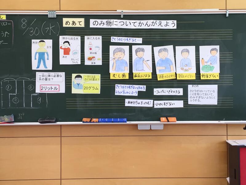 8月30日(水)の2時間目に身体測定がありました。身体測定の後、井本先生の保健指導は、「飲み物について考えよう」というテーマでした。水分補給の大切さについてお話を聞きました。体は3分の2が水分であることを聞いて子どもたちは驚いていました。どんな物をどのように飲めばいいかを考えました。暑いときや運動したときなどは、炭酸ジュースやスポーツドリンクなど甘い飲み物も欲しくなります。よく見かける飲み物の糖分の量にあらためてびっくりしました。