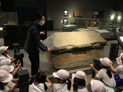 装飾古墳館では、屋外で古墳の説明を聞いたり、館内の展示物について教えてもらったりしました。山鹿の宝物を知り、大切にしていこうという気持ちが高まったようでした。また、古墳の装飾をモチーフにした缶バッジも作り、自分オリジナルのお土産と素敵な思い出になりました。