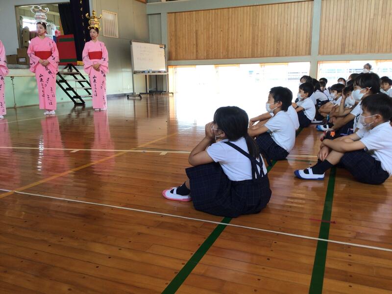 4日(火)1時間目の生活科の時間に「学校に山鹿灯籠がやってくる」の取り組みで、山鹿市の観光課の方1名と山鹿灯籠踊り保存会の方3名がめのだけ小に来校されました。
