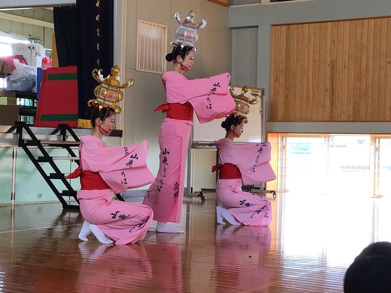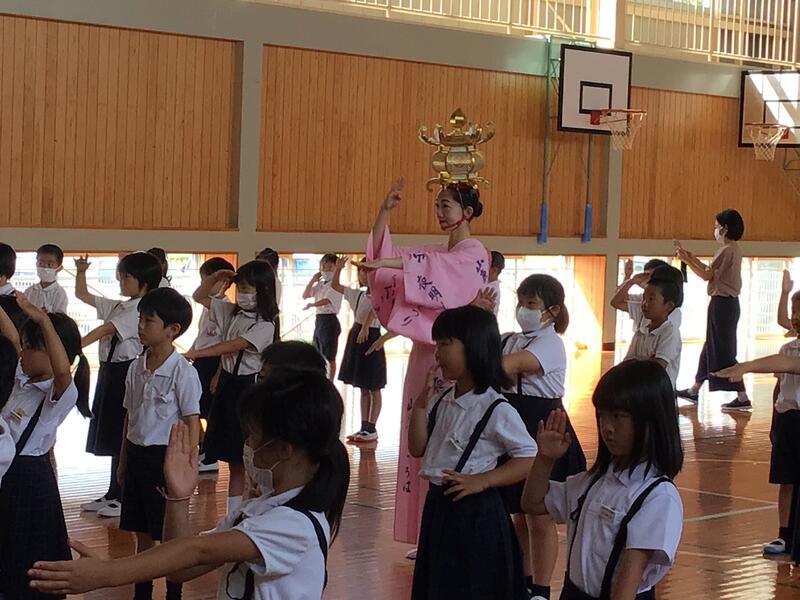 初めに、山鹿灯籠祭りの説明と灯籠踊りの説明のビデオを視聴しました。次に、灯籠踊り保存会の3名の方が二通りの灯籠踊りを披露してくださいました。子どもたちは、静かに流れるような踊りの美しさに魅了されていました。