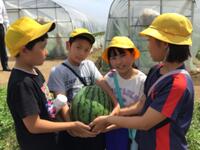 楽しみにしていたスイカの収穫に行きました!ビニールハウスの中の暑さにびっくりし、汗をかきながら農家の方々の大変さに気づいた子どもたち。グループで大きさや着果棒の色を見て収穫するスイカを選び、蔓を切って収穫。「重ーい。」と言いながら大事そうにスイカを抱えていました。収穫後は、とれたてのスイカを切っていただき、みんなで頬張りました。みずみずしくて甘くて、とってもおいしかったです!