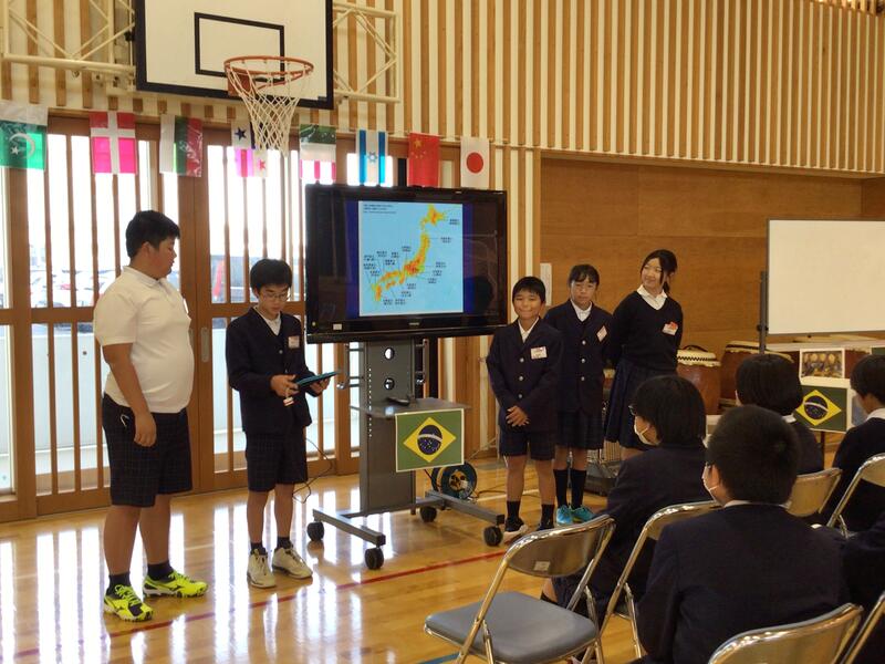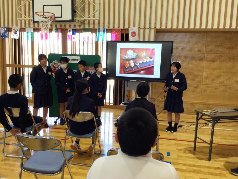 (前半は、5人のALTやCIRの方に向けて、日本のおすすめしたいものを英語で立派に紹介しました。後半は、ALTやCIRによる英語の活動や母国の紹介等を楽しみました。)