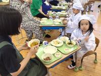 給食試食会では、家庭部の保護者の方々にお手伝いいただき、保護者の方々と1年生で一緒に給食を食べました。親子で向かい合って食べる給食に、うれしそうにする子どもたちもいました。