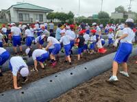 6月12日(木)の3時間目に花植え、13日(金)のめのっこタイムに芋植えを縦割り班で行いました。