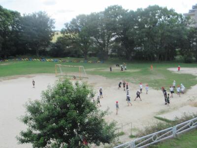 アウトドアスポーツクラブは運動場いっぱい使って鬼ごっこをしていました。