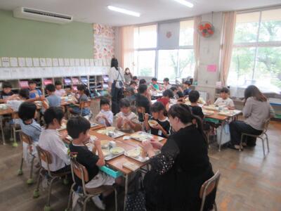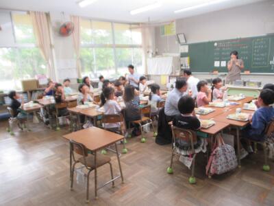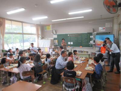 月曜日の給食に、荒尾市長、副市長、教育長、教育委員さんの6名の方々が2年生と会食に来られました。JAより給食センターに300個ほどの梨の提供があり、給食センターで1個1個皮をむいて切って給食に出してくださいました。新聞社からも取材に来られ、楽しい会食の時間でした。いつも「校長先生~!」と寄ってきてくれる人懐こい2年生です。初めて一緒に給食を食べるお客様にも親しげに話しかけ、喜んで帰られました!