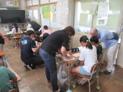 環境学習のあと環境センターの見学をした子どもたちは、早めの昼食をとって、午後の水俣病学習にそなえています。