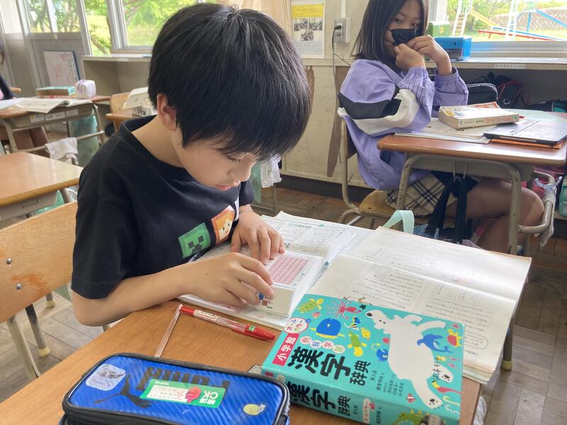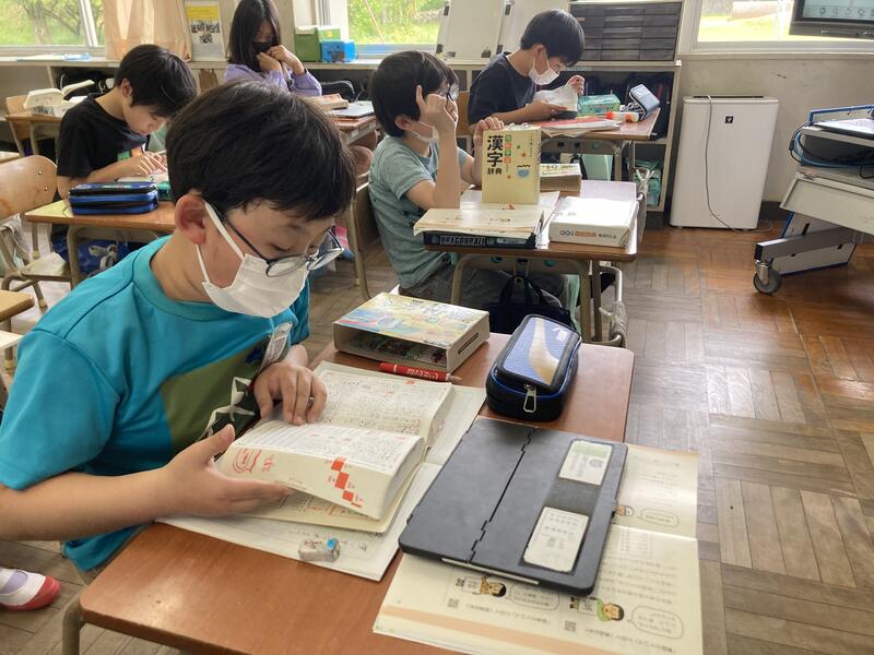 暑くなってきて疲れが出る午後の授業も、しっかり集中しています。漢字辞典の使い方を身に付けているところ。