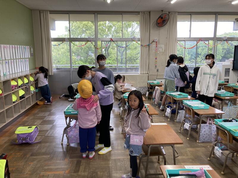 今朝も、6年生が朝のボランティアに励んでいます。雨の日で、室内を清掃する6年生の姿がありました。また、1年生教室で1年生の朝の準備のお手伝いをする姿もありました。