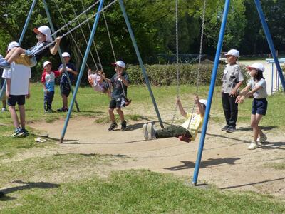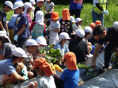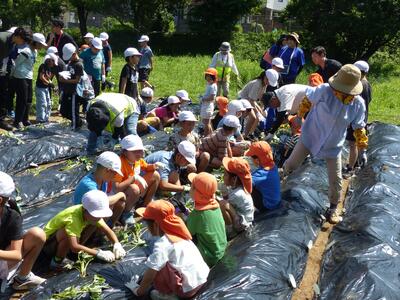 昨日4年生がいもの苗植えを行いました。残念ながら私は出張のため参加できませんでしたが、カンガルー保育園の年長さんも招待して一緒に行いました。地区協議会はじめ地域のみなさんも応援に駆けつけてくださいました。この日のために先生たちが畑の準備やマルチ張りを放課後の時間にしてくださいました。いもの苗植えが終わったら、保育園のみんなと4年生で一緒に遊んだようです。やさしいお兄さんお姉さんぶりを発揮してくれたようです!秋に大きなおいもが収穫できるといいですね。