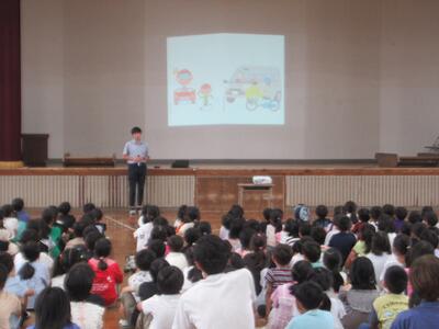 昨日のお昼に臨時の全校集会を行いました。本年度に入り2件の交通事故が発生したことを受けて、もう一度安全について考えてもらいたいという思いで実施しました。安全担当の西岡先生から、交通ルールを守ること、室内での過ごし方のお話を通して、ルールはみんなのためにあるというお話をしていただきました。本校の校区内は交通量も多く、いつも登下校や放課後の遊び方について心配しているところです。ご家庭でもぜひ話題にしてください!