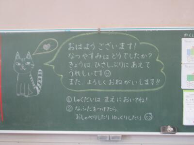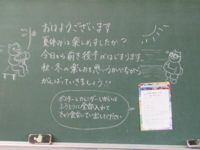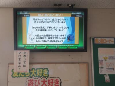 いよいよ今日で夏休みが終わります。おうちの方はホッとされているところでしょうか?学校では明日のスタートに向けて準備が整ったようです。担任の先生方は、教室の整理と子どもたちへのメッセージ、授業の準備と走り回っておられます。電子黒板のメッセージも明日用に変更されていました。以前「ふわふわの木」があったところには、何やら新しい木が準備されています。夏休み明けからの取り組みです。明日は全員元気に登校してくれることを期待しています!