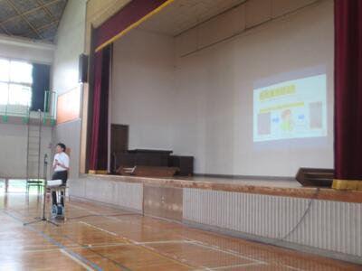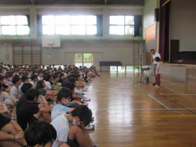 久しぶりに子どもたちの元気な声が学校に戻ってきました。朝から夏休み後集会を体育館で行いました。最初に入場した3の1と5の1が静かに待ってくれたおかげで、あとから入場するクラスも整然と入場することができました。集会に先立って、夏y炭中に転居が決まり、緑ケ丘小から転校することになったお友達の紹介を行いました。寂しくなりますが、新しい学校でがんばってほしいと思います。その後の校長の話では、前期後半に「あいさつ」をがんばってほしいとお話ししました。「いてより先に、つでもどこでも、わやかに、づけよう!」の合言葉であいさついっぱいの緑ケ丘小にしていこうと話しました。明日からのあいさつが楽しみです。続いて西岡先生から、前期後半の取り組みとして「名札をつけよう」の話がありました。全員付けたら、玄関の木に実をつけていくという取り組みです。たくさんの実がなることを願っています。これから前期の終業式に向けて、暑さに負けずがんばっていきましょう!