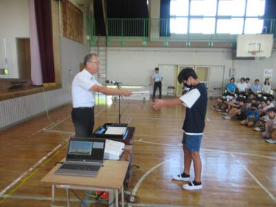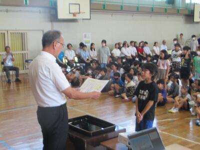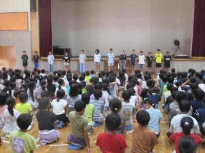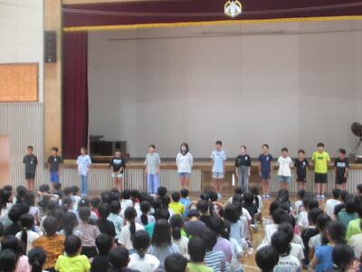 本日で前期が終了しました。4時間目に終業式を行いました。いつも通り整然と入場ができた子どもたちでした。式に先立ち、「社会を明るくする作文コンクール」と「科学研究物及び発明工夫展」の表彰を行いました。代表の子どもに賞状を渡しましたが、後期もたくさん表彰できるといいなと思いました。終業式では「成長したこと」「学校を支えてくれている高学年」「たくさんの行事」「みどりっこの自慢」について写真を見ながら振り返り、みんなのがんばりを称えました。お話の聞き方もとても上手でした。そのあと2年生、4年生、6年生が前期を振り返って作文発表をしてくれました。みんなの前で堂々と発表することができました。たくさんがんばってきた子どもたちです。後期さらに成長できるように職員一丸となってがんばっていきます!