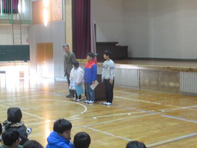 今日から後期後半がスタートしました。寒い中でしたが、みんな元気に登校してくれました。久々に子どもたちの声が響いた学校で、朝から冬休み後集会を行いました。集会に先駆けて、秋に行われた図工美術展の表彰を行いました。たくさんの子どもたちが紹介され、代表の5年生が賞状を受け取りました。残り3ヶ月もたくさん表彰できるとうれしいです。集会では、教頭先生にお話ししていただきました。冬休みを振り返り、みんなが楽しい学校生活を送れるようにというお話でした。そのあと、1年生、3年生、5年生の代表が目標を発表してくれました。いよいよ次の学年に進むための準備が始まりました。残り3ヶ月という短い時間ですが、楽しい緑ケ丘小学校になるようみんなでがんばりましょう!