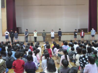 今日のお昼に児童集会がありました。今日は、給食委員会の発表でした。給食委員会の仕事の説明やクイズ、給食週間にについて発表してくれました。毎日おいしい給食を作ってくださる給食センターのみなさんに感謝して、後片付けまできちんとしましょうという内容でした。