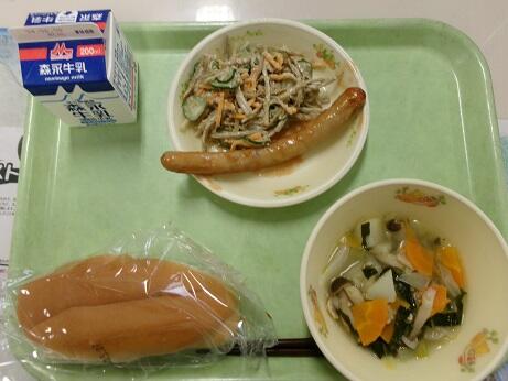 今日の給食:セルフドッグ、野菜スープ、ごぼうサラダ、ウインナー、牛乳