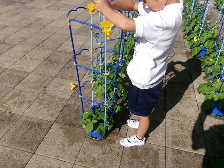 1年生はアサガオを、2年生は「キュウリ・ピーマン・トマト・ナス」から1種類を選んで、世話をしています。おいしそうな野菜ですね。