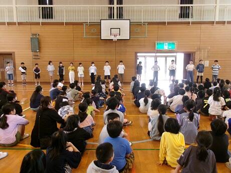 1年生を迎える会です。計画委員会が進めてくれました。「選択クイズ」や、「心を一つにあっちむいてホイ」などを行いました。1年生がとても喜んでくれました。