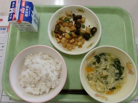 今日の給食:麦ごはん、かき玉汁、レバーとポテトの揚げからめ、牛乳
