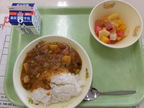 今日の給食:くまもとの赤野菜カレー、すいか入りフルーツカクテル、牛乳