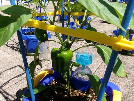 1年生はアサガオを、2年生は「キュウリ・ピーマン・トマト・ナス」から1種類を選んで、世話をしています。おいしそうな野菜ですね。